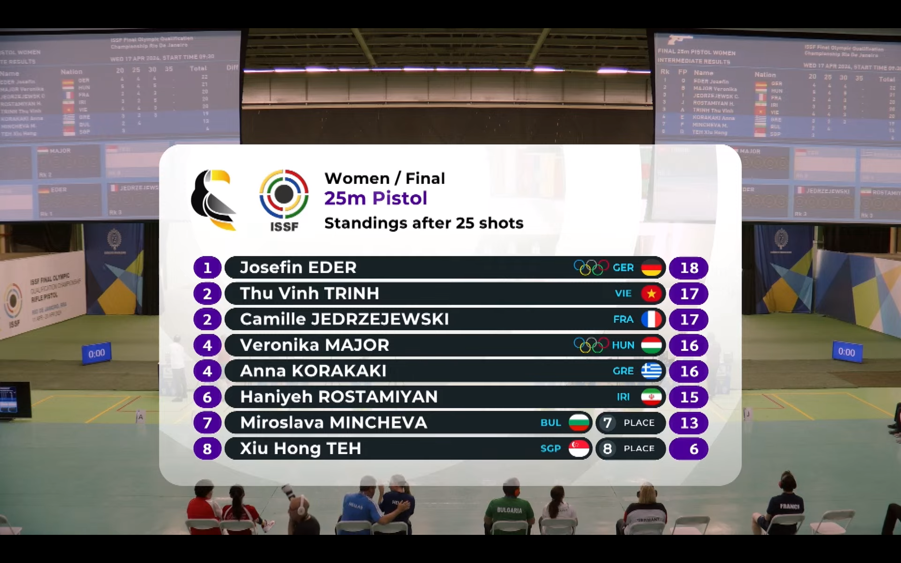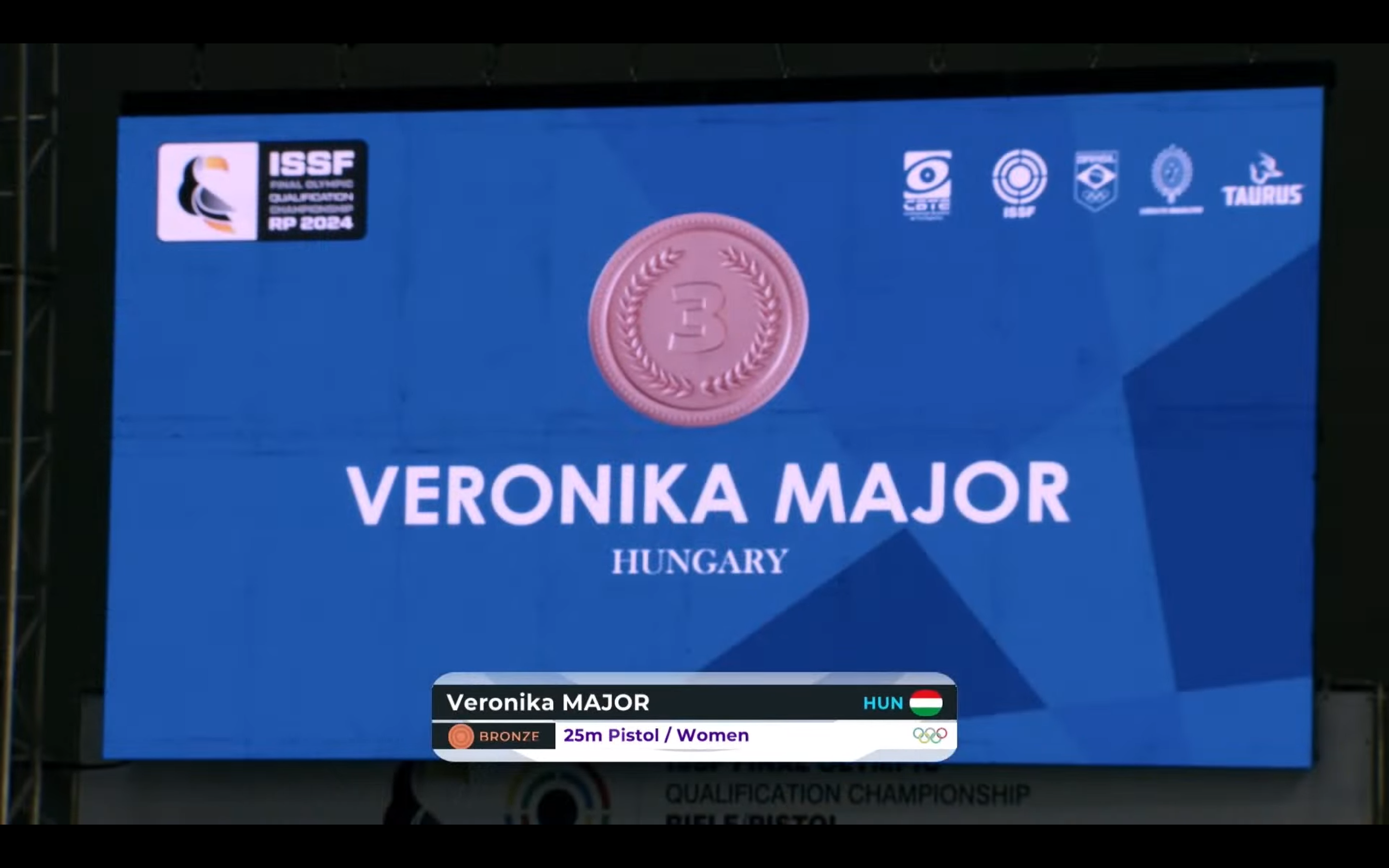 Bár Major Veronika az első három sorozat után hét találattal még csak a 6-7.helyen állt, a folytatásban kiválóan lőtt, hiszen előbb egy hibátlan sorozat következett, majd az ötödikben ötből négy találatot ért el. 25 lövés után így már a 4-5. helyen állt a holtversenyben. Közben pedig befejezte a versenyt az olimpiai kvótáért folytatott harcban bolgár és szingapúri ellenfele, előbbi a hetedik, utóbbi a nyolcadik helyen zárt. Így már ekkor biztossá vált, hogy Major Veronika megszerezte a magyar sportlövők negyedik párizsi kvótáját. Major Veronika egy újabb hibátlan sorozatot követően már a második helyre lépett előre. A folytatásban előbb ötből egy, majd ötből három, végül ötből öt találatot ért el, és bronzérmes lett.